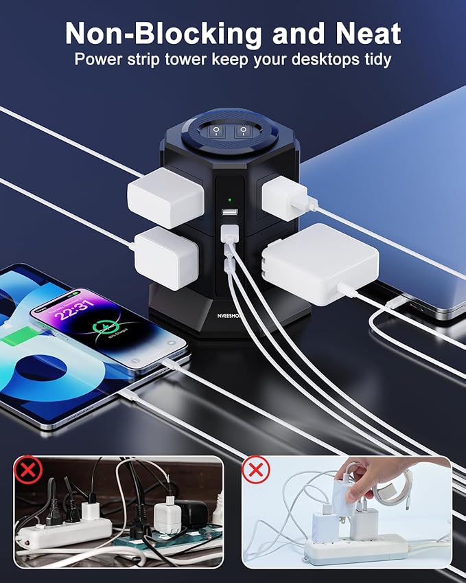 - SEPARATED DUAL SWITCHES: The top of the surge protector power strip tower has two independent switches that control the power strip surge protector tower on/off of both sections, making it easy to turn off multiple unused electronic devices without having to plug and unplug the switches, making it easier for you to manage all your connected devices and reduce power supply waste.