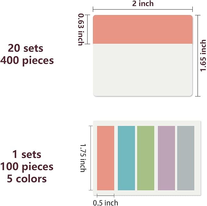 - 500 pieces Book Tabs: 500 pieces 21 sets in total, 400 pieces 2 inch sticky tabs in 20 sets with 10 different pastle colors,100 pieces 0.5 in tabs in 1sets, 20 pieces each color