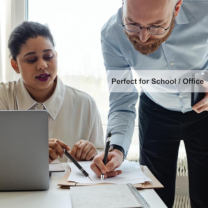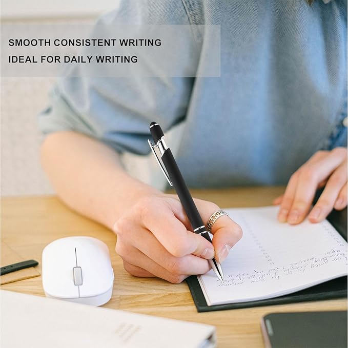 LINFANC 12 Pack Black Silver Ballpoint Pen with Stylus Tip, 1.0 mm Black Ink Smooth Writing Pens, Metal Stylus Pens for Touch Screens
