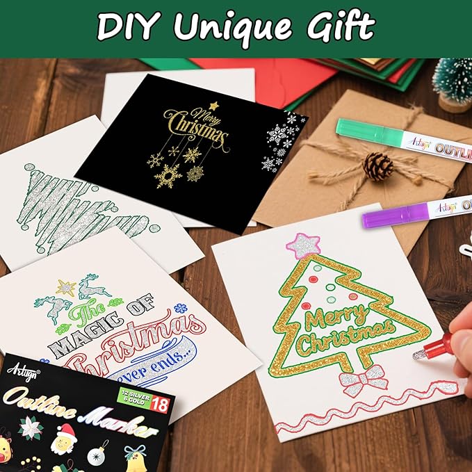 - 【18 Colors Sparkly Glitter Markers】 This pack of Artugn Outline Markers contains 12 silver-based and 6 gold-based metallic outline markers, bright and shimmer metallic color could meet various of DIY creation; create a unique and stylish outline to make your artwork and letter stand out on dark and bright surfaces alike. Pick up these outline markers and let your imagination go.