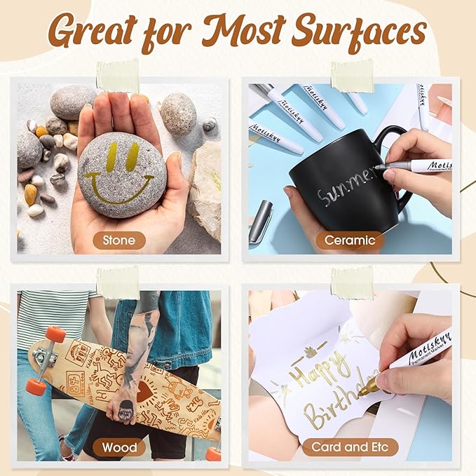 - Wide Use: these colored permanent markers can add metallic touch to your projects such as black paper, gift or thank you card, glass bottle, wood, craft ornament and DIY photo album for calligraphy, lettering, drawing and signature