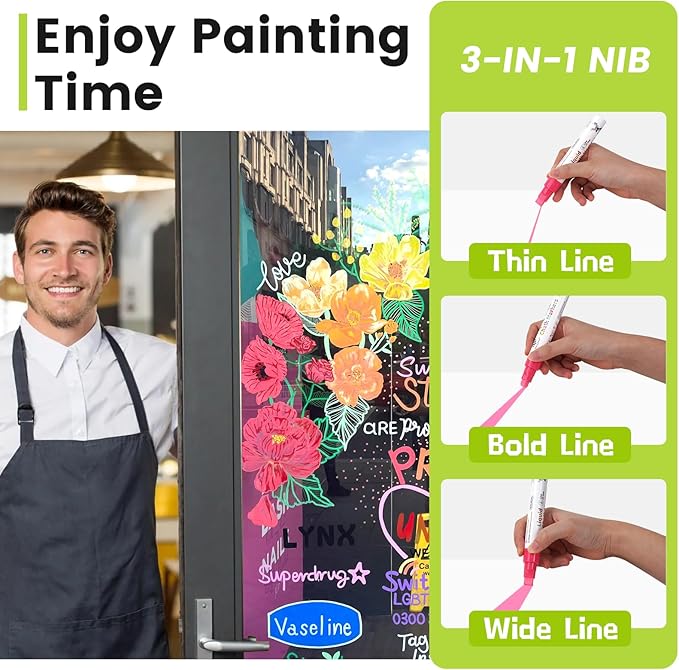 - 10MM 3-IN-1 TIP: The 10mm nib allows allows you to draw fine, bold, and wide lines, making these window markers for glass washable ideal for both detailed and large designs. Effortlessly switch between detailed work on wide strokes on windows and blackboards.