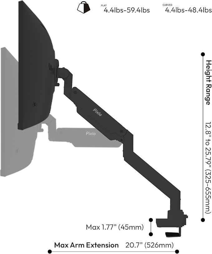 - Upgrade your workspace with the Pixio PS2S Titan Black monitor arm. This heavy-duty stand securely holds ultrawide monitors up to 57 inches and supports up to 59.4 lbs. Enjoy flexible viewing angles with height, tilt, and swivel adjustments. Integrated cable management keeps your desk organized.
