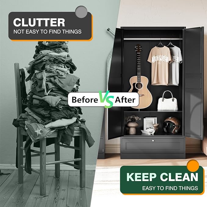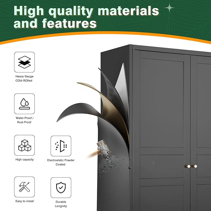 - Superior Materials : Our wardrobe is constructed from large thickened cold-rolled steel plates for exceptional strength and durability. The wardrobe is finished with an electrostatic powder coating, making it scratch resistant, wear resistant and easy to clean. This design is more durable than traditional wooden wardrobes.