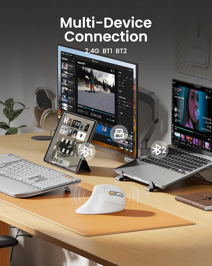 - Connect up to 3 Devices: This ergonomic wireless mouse features dual BT 5.0 and 2.4G USB connectivity modes for simultaneous connection of up to 3 different devices, and is compatible with Windows 8, Windows 10 or higher, Mac OS X 10.12 or higher, and Android 4.3 or higher