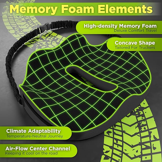 Large Truck Seat Cushion for Truck Driver Seat Cushion - Upgraded Back Support, CertiPUR-USยฎ Certified - Thick Memory Foam, Pain Relief for Hours of Driving, Trucker Approved Big Rig - Black