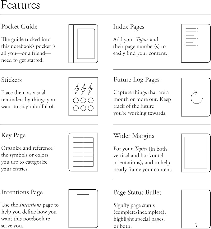 - Built for BuJo: Edition 2 is packed with BuJo specific features including a Bullet Key, Index, and Future Log. The BuJo pocket guide is also included which features lots of new information and visual examples; a great resource for new and experience bullet journalists. Bonus - it fits into the back pocket of the notebook and serves as a ruler