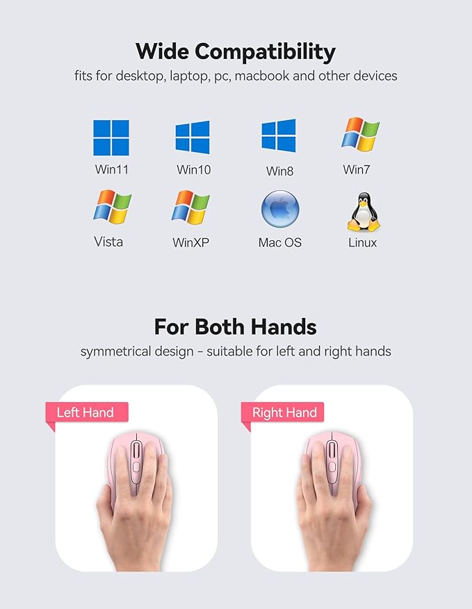- Wide Compatibility & Low Power Warning: The wireless mouse for laptop can be well-compatible with Windows 11/10/8/7/XP, Vista 7/8 and Linux, etc. Fits desktops, laptops, PC, Macbooks, and other devices; and the LED battery indicator warns you if the battery is running low.