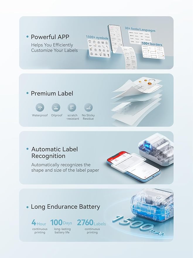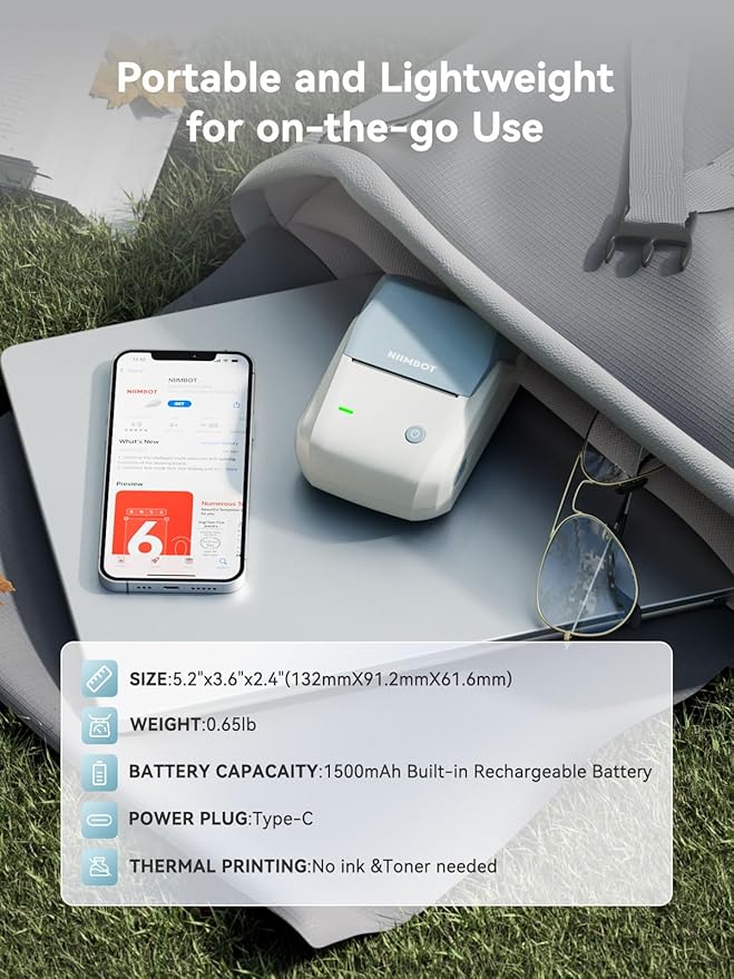 - Portable and Rechargeable: The thermal label printer weighs just 293g, making it compact enough to fit in your pocket and easy to carry anywhere. It features a built-in 1500 mAh rechargeable battery, providing up to 100 days of standby time on a single charge.