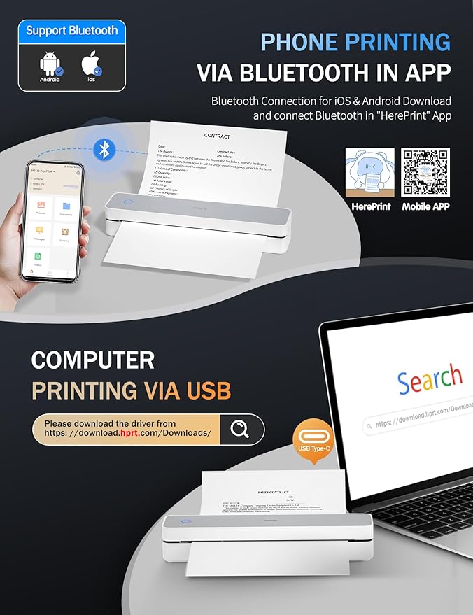 - Easy to Use: The portable thermal printer supports Bluetooth (mobile phone APP) and USB (PC) connections. Connect via Bluetooth on your phone: (1) Download the "HerePrint" application from the App Store. (2) Turn on the inkless portable printer. (3) Turn on the mobile phone Bluetooth and add the MT610 Pro in the application to establish a Bluetooth connection. For USB-C connection on the PC, you need to follow the steps in the manual to install the driver.