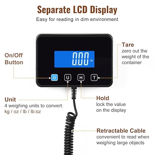 - 【Accurate & Wide Weighing Range】: The measurement range of this shipping scale is from 0.2 lb to 660 lb; Equipped with a high precision sensor making it a reliable and accurate choice for your different weighing needs. Graduation: 0.2 lb - 88 lb: 0.04 lb; 89 lb - 660 lb: 0.2 lb