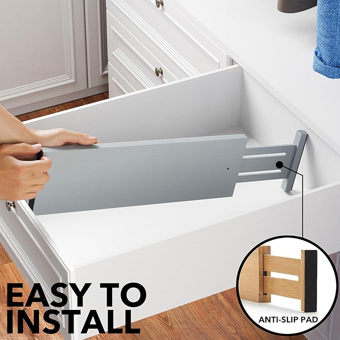 - Drawer Dividers That Stay in Place: Strong spring-loaded design makes them sturdy dividers, with non-slip rubber pads in the end, keeping it stay put all the time and protect your drawers from scratches