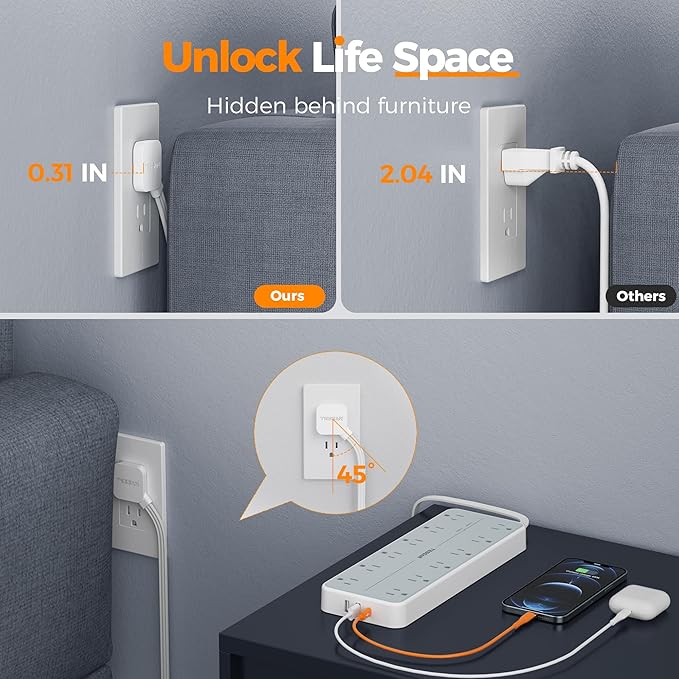 - Flat Extension Cord: Featuring an ultra 0.31in flat head design, 5ft extension cord flat wall plug can fit in tight spaces and hide behind sofa, nightstand or other furniture; 45 degree angle design create an extra space for other plug below without blocking