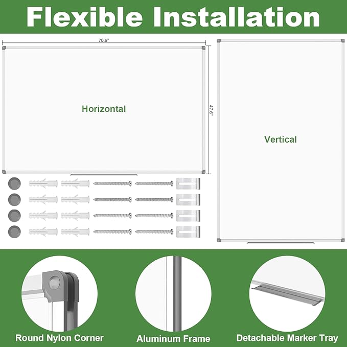 - Easy to install: The whiteboard can be installed horizontally or vertically. Flexible installation to fit your space needs.