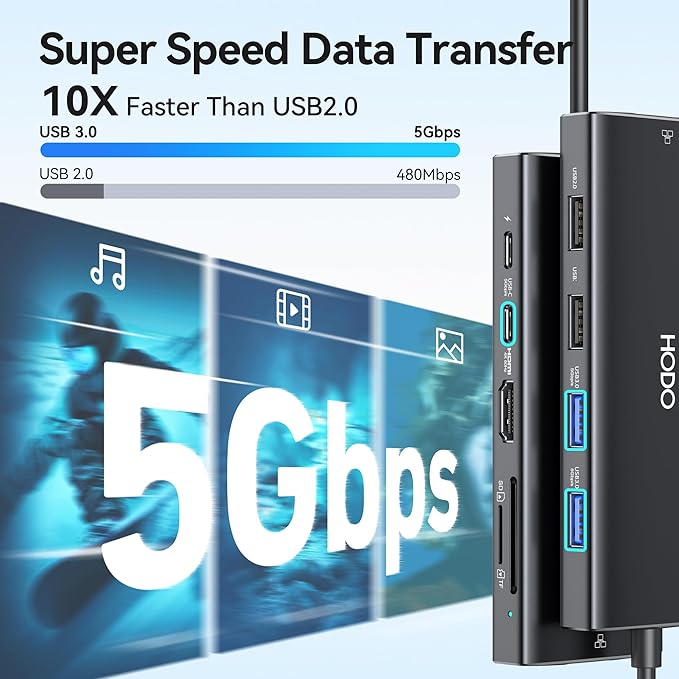 - Super Speed Data Transfer Ports: This type c hub comes with 3 usb 3.0, 2 usb 2.0 and 1 usb c ports,the transfer speed of them are up to 5Gbps, allows you transfer files in seconds from your usb flash driver, usb/usb c hard disks. Please connect wireless mice and keyboard with usb 2.0 to reduce interference. Note: This usb c docking station adapter only 1 HDD/SSD can be connected at the same time. Also, Logitech wireless mice and keyboards connecting not supported.