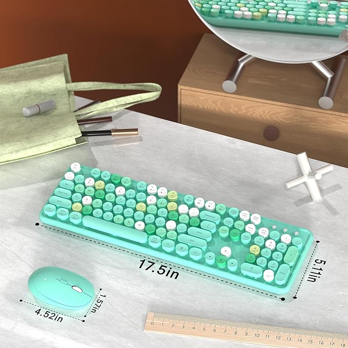 Colorful Wireless Computer Keyboard and Mouse Combo with Round Typewriter Keycaps, Retro Design, Power Switch, Ergonomic Design, 2.4GHz Wireless for Windows, Mac, PC(Green-Colorful)