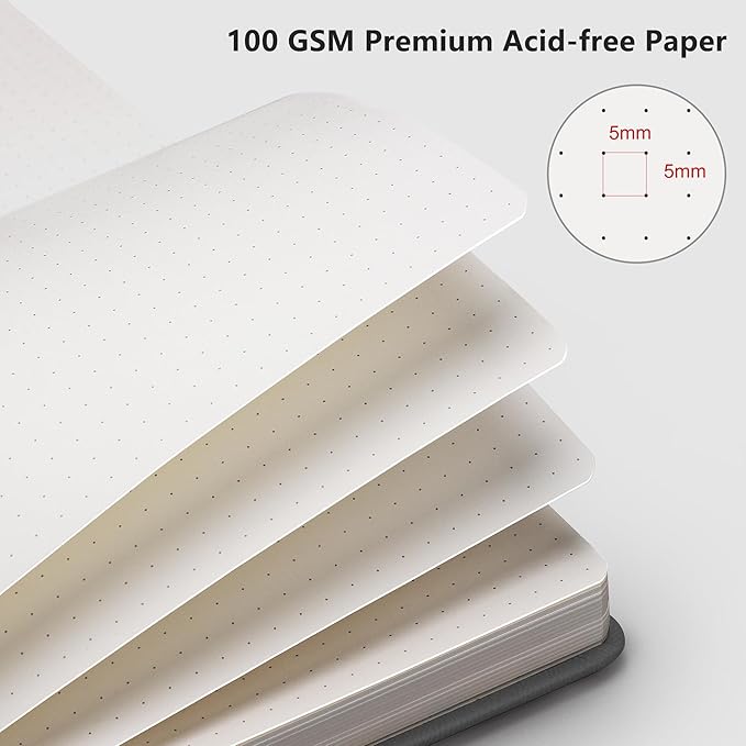 - PREMIUM PAPER: Crafted with time-resistant 100 GSM paper, this dotted journal preserves thoughts flawlessly while resisting ghosting/bleed-through with most pens. Acid-free material ensures long-term preservation, and its smooth surface enhances writing clarity - blending durability and premium performance