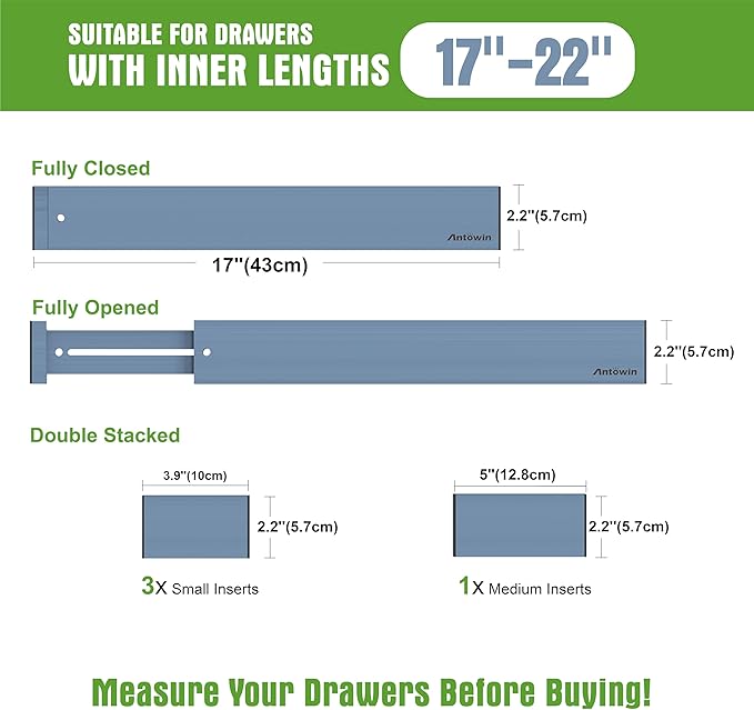 - Expandable Drawer Organizer: Each Measures 17" x 2.36" x 0.6" ; Expands from 17" to 22" long. 3 pcs Small drawer divider Measures 3.7" x 2.36" x 0.5" .