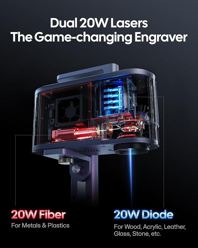 - Pro-Grade Cutting: 20mm Wood & 0.5mm Metal. 20W diode cuts 20mm wood/15mm acrylic; fiber laser slices 0.5mm brass/titanium. The only dual-laser system handling thick crafts and jewelry metals.