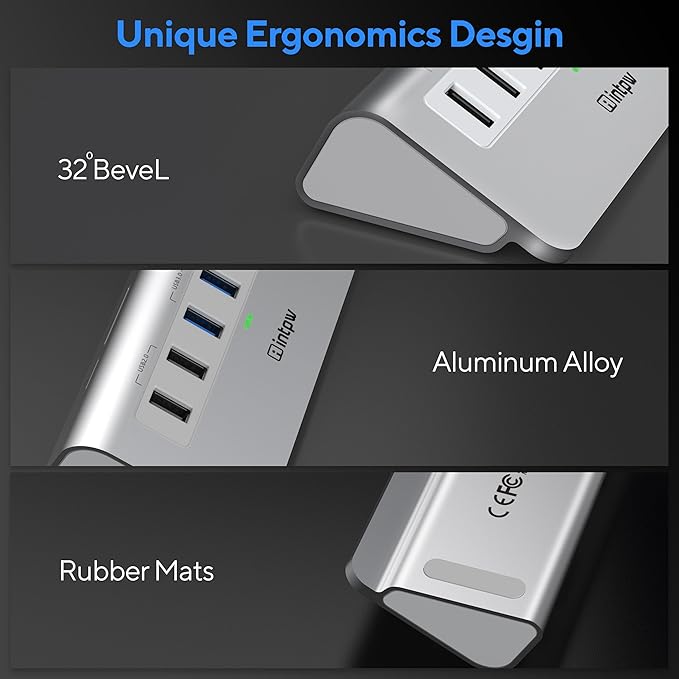 - ✅ Aluminum Ergonomic Design: Different from other usb c hub's plastic materials, this powered usb hub with aluminum unibody provides premium protection with a slick look and a better heat dissipation. Temperature control under 45℃, keep all the USB ports safe and stable during operation. Ergonomics 32-degree angle and rubber mats, saving more effort when you plug and unplug your USB devices and placing more stability on your desk. Appearance also is unique, fashionable and modern.