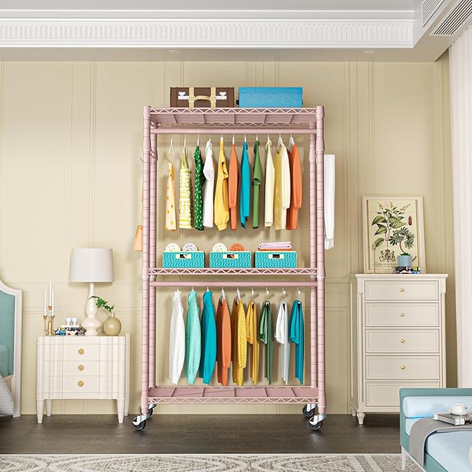 P1 Heavy Duty Garment Rack, 3 Tiers Adjustable Rolling Metal Closet Organizer with Lockable Wheels, FreeStanding Wardrobe with Double Hanger Rods & 1 Pair Hooks, Max Load 450 LBS, Pink