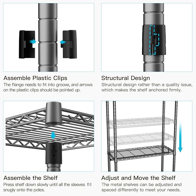 - [Easy to Assemble]: A rubber hammer (NOT INCLUDED) is recommended to gently hit the shelves to make it more compact. Easy assembly, no other tools needed