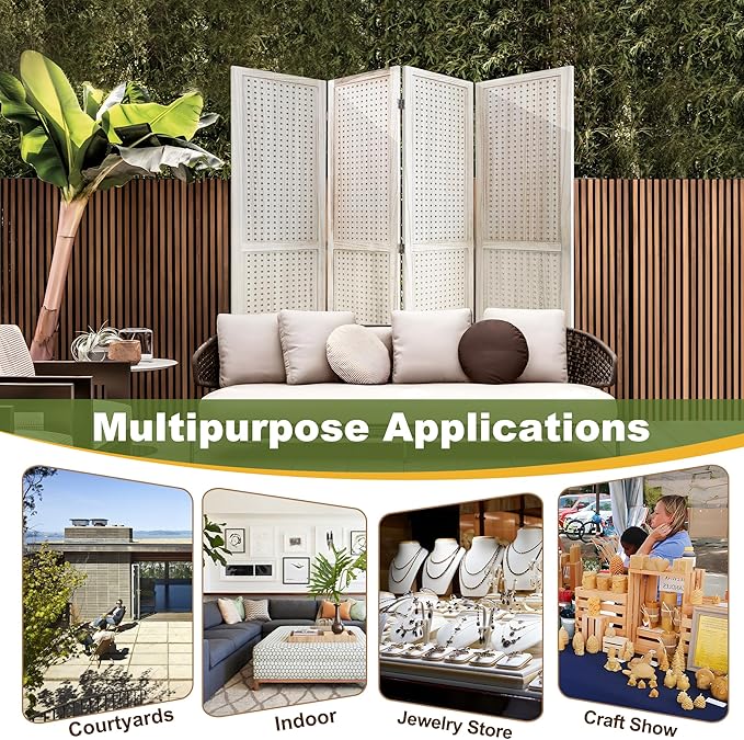 - Versatile Pegboard Panel Design:Our pegboard panel features 0.3-inch diameter holes spaced 1 inch apart, compatible with various peg hooks. This room divider doubles as a decorative folding privacy screen or wall organizer, and serves as a freestanding display panel for trade shows, craft fairs, department stores, and more.