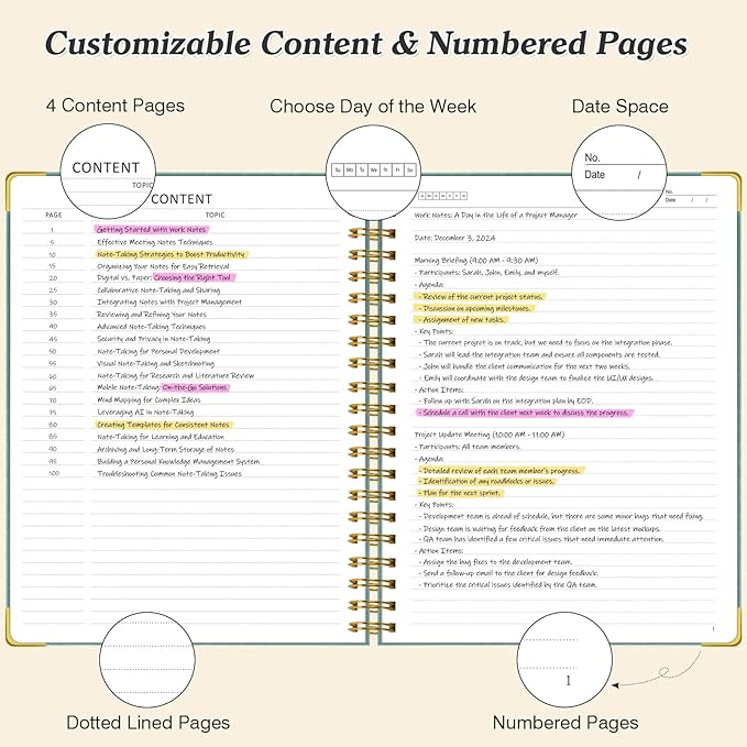 - 【300 Numbered Pages with 4 Contents】Thick journal features a total of 304 pages, with 300 numbered pages and 4 dedicated contents pages . This section allows you to easily reference important notes or sections by marking them upfront for quick and organized access. Each page includes a double-sided header where you can specify the day of the week and enter the date with the format "No. ___ Date ___," making organized note-taking effortless. Ideal for keeping track of tasks and events.