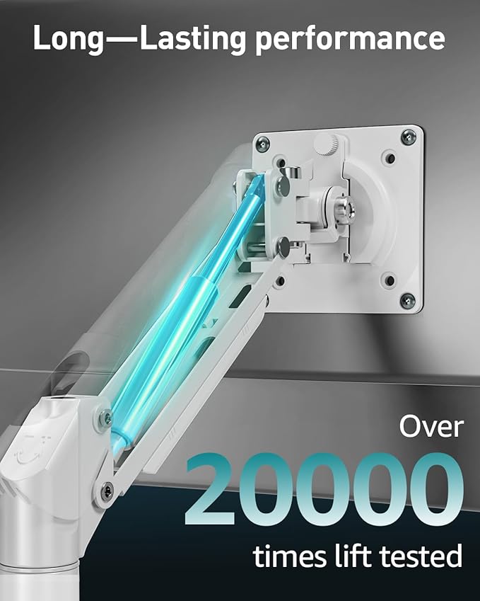 - Strong Support: The single monitor mount is designed with aluminum arm and a strong gas spring that has undergone 20,000 motion tests to ensure long-lasting performance and provides excellent stability to support monitors from 4.4 to 22 lbs. You can extend the monitor arm out 19.7″ to bring your screen closer or raise it up to 17.3″ above the desk surface for a better viewing position. This dynamic adjustment makes it possible to position your screen closer to eye level for more comfort.