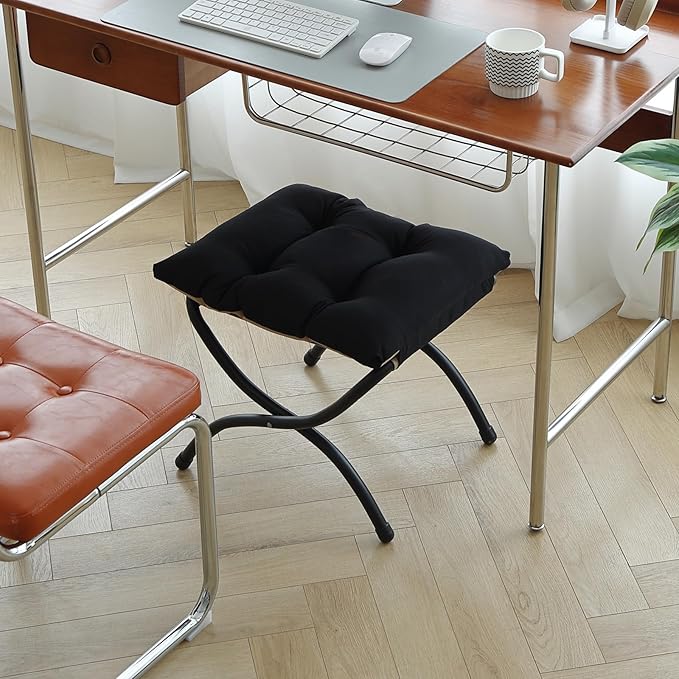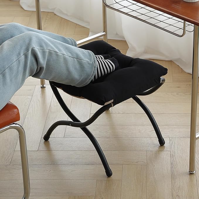 - REMOVABLE THICK COTTON CUSHION FOOSTOOL: This detachable cotton cushion is thick and soft, and it's fantastic. Whether you use it to relax your feet or sit on it to rest, you can feel very comfortable. The folding ottoman is perfect as a foot stool on its own, or as an ottoman when you're lying on a sofa or lazy chair,increasing your relaxation and comfortModern Folding Footrest Stool, Small Accent Portable Ottoman, Comfortable Metal Cotton Anti-Slip Footstool, Dark Grey
