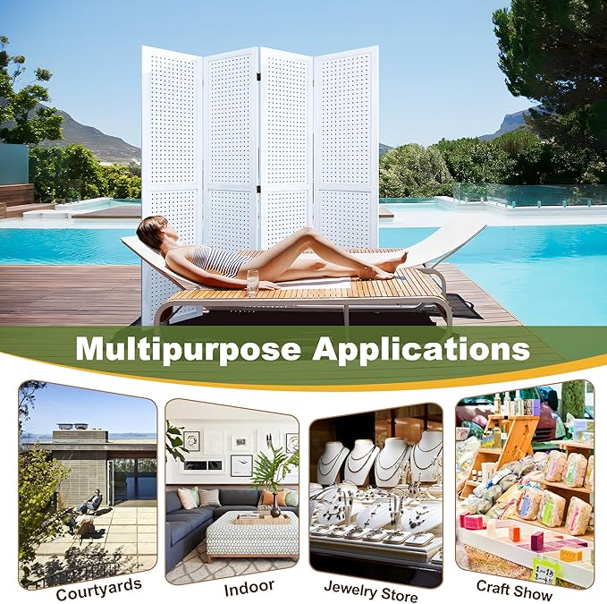 - Versatile Pegboard Panel Design: Our pegboard panel features 0.3-inch diameter holes spaced 1 inch apart, compatible with various peg hooks. This room divider doubles as a decorative folding privacy screen or wall organizer and is a freestanding display panel for trade shows, craft fairs, department stores, and more.