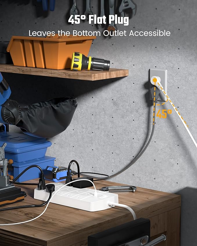 - Space-Saving Design: A clean workspace is essential for efficiency and productivity. A 45° flat plug is meticulously designed to fit in tight spaces behind the workbench or furniture, while leaving the bottom outlet usable. Screws and a drill template are included for you to easily wall-mount the power strip for easier access to power.