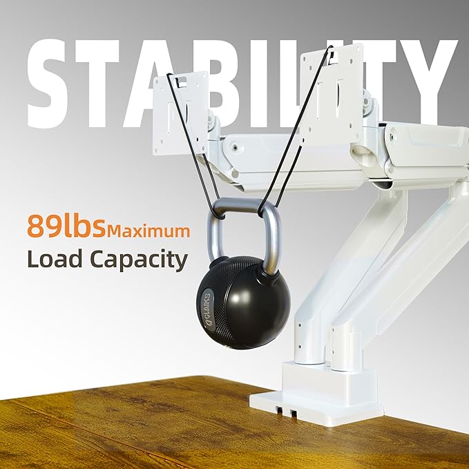 Claiks Dual Monitor Mount for Max 35 inch Screens Stand up to Max 89 lbs, Ergonomic Gas Spring Heavy-Duty Adjustable Monitor Arm, with Clamp and Grommet Base, VESA Mounting Holes 75&100mm, White