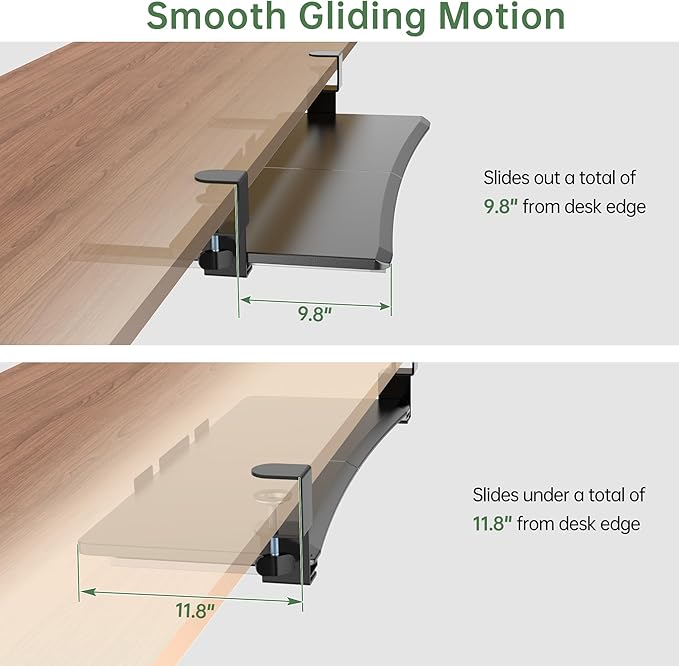 - 【Comfortable Typing Angles】 Slide in and out of the tray with ease and enjoy an ergonomic typing angle that reduces stress on your wrists and shoulders. The tray extends a maximum of 9.8” from the edge of your desk. and slides under a total of 11.8” from desk edge. PLEASE NOTE: The distance from the center stretcher to the edge of the desktop must not be less than 11.8 inches.