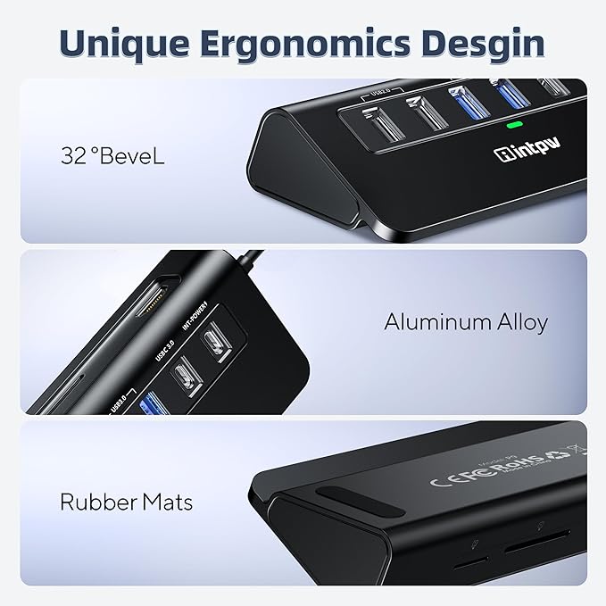 - Aluminum Ergonomic Design: 32-degree angle and rubber mats, saving more effort when you plug and unplug your USB devices and placing more stability on your desk. Aluminum unibody provides premium protection with a slick look and better heat dissipation