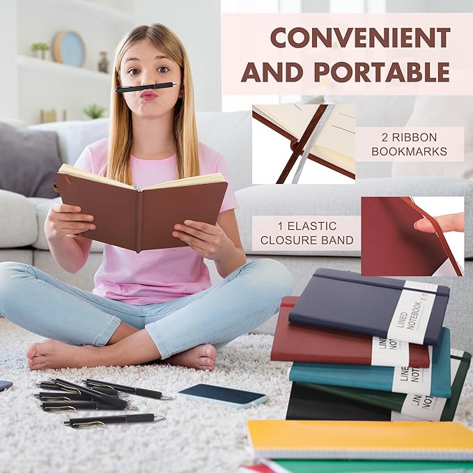 - Quality leather & paper: our A5 notebooks are made of 100 gsm thick paper, providing a smooth touch and resisting ghosting and bleeding, compatible with most pens, pencils and markers; the lined journal notebook with pens feature premium PU leather hardcover, waterproof and easy to clean, helping the notebooks stay upright without the pages curling or bending; the ballpoint pen is designed with a 0.5 mm bold tip for smooth, non-leaking drawing, ideal for use with the journal