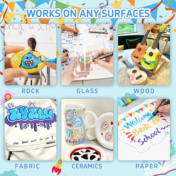 - Working on Any Surface: Our acrylic dual tip markers are suitable for use on almost all surfaces, including ceramic, wood, fabric, stone, metal, plastic, canvas, shoes, eggs, paper, clothes, models, leather, create DIY arts and crafts graffiti projects on a wide variety of surfaces to your heart's content