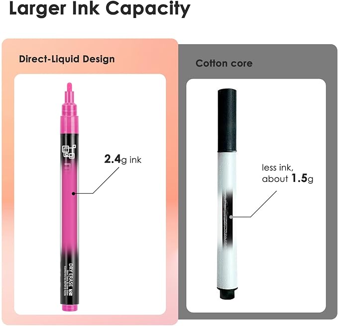 - Enhanced Ink Capacity: Our neon glass markers with Direct Ink System hold 2.5g of ink, 40% more than traditional Cotton Core ones. Write more, refill less. Enjoy prolonged use for your creative needs!