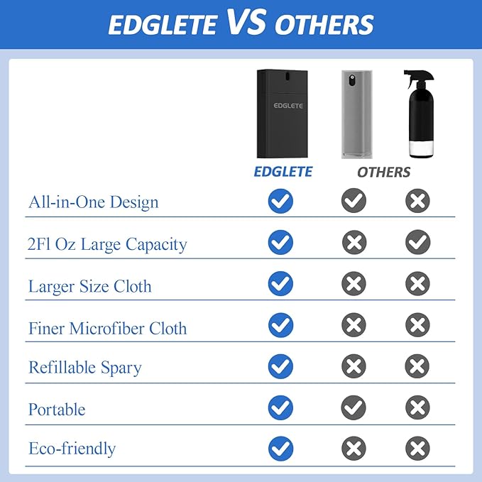 - SAFE FOR SCREENS - Edglete computer screen cleaner is crafted with a safe, gentle, and effective formula, ensuring it is colorless and odorless. This camera lens cleaner's quick-drying screen cleaning spray works seamlessly with the premium microfiber cleaning cloth, which is engineered to protect delicate touch screen coatings, preventing damage and scratches to anti-glare, anti-fingerprint, or oleophobic layers