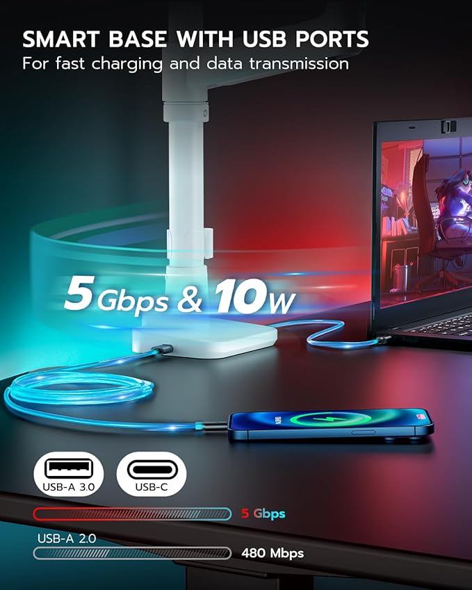 - 【Convenient USB Ports】The dual monitor stand with enhanced USB functionality allows simultaneous charging of two devices. Integrated USB-C and USB-A ports (5V/2A) enable timely charging for your phone, watch, tablet, laptop, or headphones when battery levels are low, ensuring long-lasting peace of mind during use.