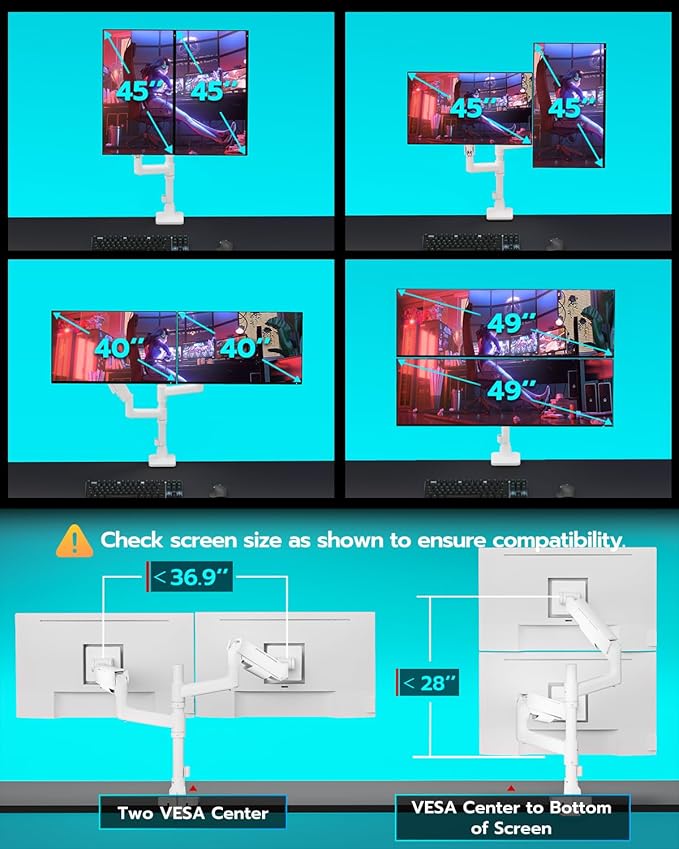 - 【Support up to 49" & 44lbs Monitors】The dual monitor mount is compatible with 17-49 inch Odyssey G9, LG, and other 49-inch monitors, including QLED, OLED, LED flat, and curved screens. Each mount for this monitor mount dual can hold monitors up to 44 lbs and is equipped with 75x75mm and 100x100mm VESA mounting holes. Note that a VESA adapter is required if your monitor does not have VESA holes.