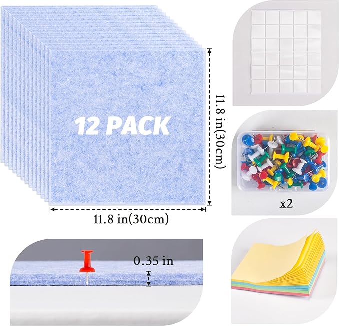 - Easy Installation & Safe Removal:Our ready-to-use kit includes 12 or 15 high-density felt pin boards (11.8"x11.8"/30x30 cm, 0.35" thick) and double-sided safe-to-remove tape for hassle-free mounting. Each set comes beautifully packaged, making it a perfect gift. Plus, we’ve included 2 boxes of push pins and 1 sticky note pad for added convenience.