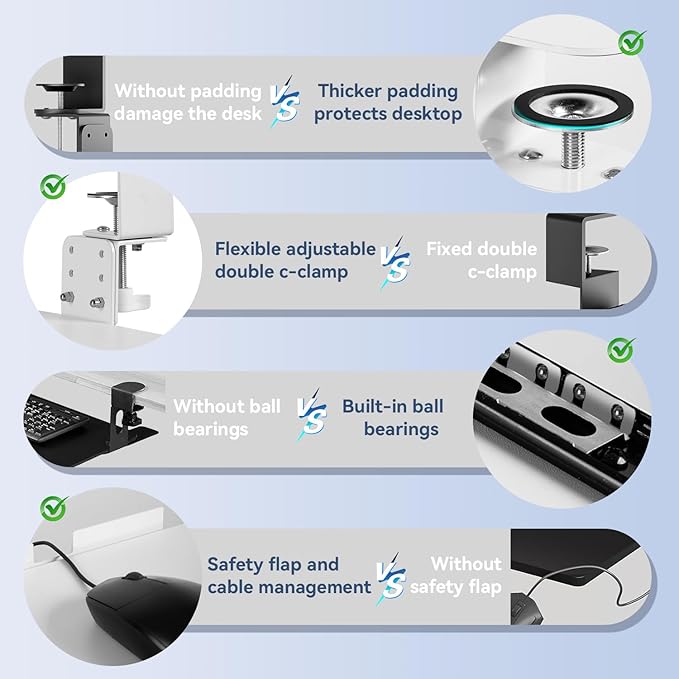 - 【QUICK & EASY INSTALLATION】Setting up is a breeze! Our under desk keyboard tray slide out tray comes with all the necessary hardware and clear instructions for a hassle-free installation. The adjustable C-clamps fit desks 0.5" up to 2.1" thick, ensuring a secure and damage-free setup