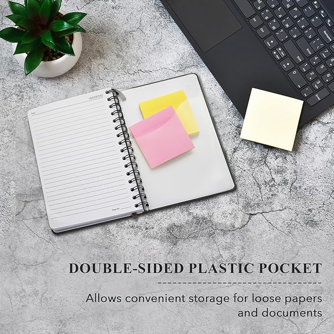 - NOTE BOOK WITH POCKETS - Our thick paper a5 journal spiral bound notebook is equipped with a double-sided plastic pocket, and lets you securely store important documents, notes, or loose papers excellent for both personal and professional use.