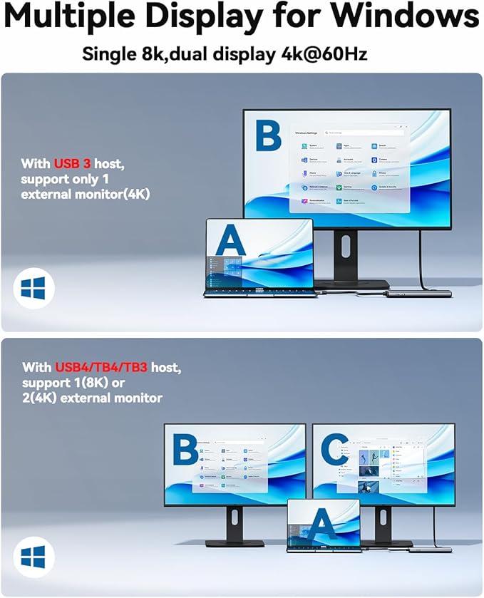 - Single 8K, Dual 4K@60Hz Video Output: The usb c hub multiport adapter has SST and dual MST display modes. By using a usb 4 hub, the display can support single 8K or dual 4K@60Hz. Vivid and clear videos and images are transmitted to external displays, bringing you an immersive 3D experience. For Windows system USB4, support single 8K, dual monitor 4K/60hz. But for MacOS, both single and dual monitors are 4K@60Hz. (NOTE: For Mac M1/M2, the usbc dongle adapter only support 1 monitor)