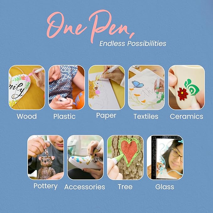 - MULTI-SURFACE VERSATILITY: Works effortlessly on wood, fabric, metal, plastic, paper, pottery, jewelry, and more. Whether you're decorating picture frames, scrapbooking, or stenciling walls, this pen delivers great results across a wide range of surfaces.