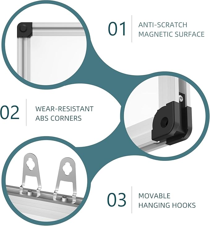- Great Accessories: 1 Magnetic Eraser, 2 Markers, 1 Detachable Marker Tray, 6 Magnets, Sturdy aluminum frame built with ABS plastic corners, with no sharp or pointed edges