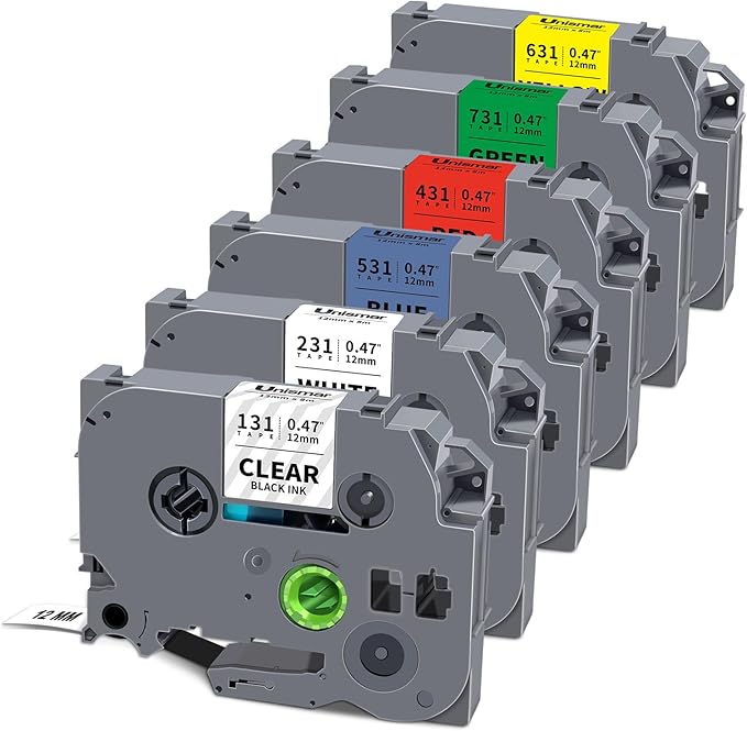 Unismar 6-Pack Compatible for Brother P Touch TZe-231 131 431 531 631 731 TZe TZ Tape 12mm 0.47 Laminated Clear/White/Red/Blue/Yellow/Green for Ptouch PT-D210 D220 H110 D400 D410 Label Maker