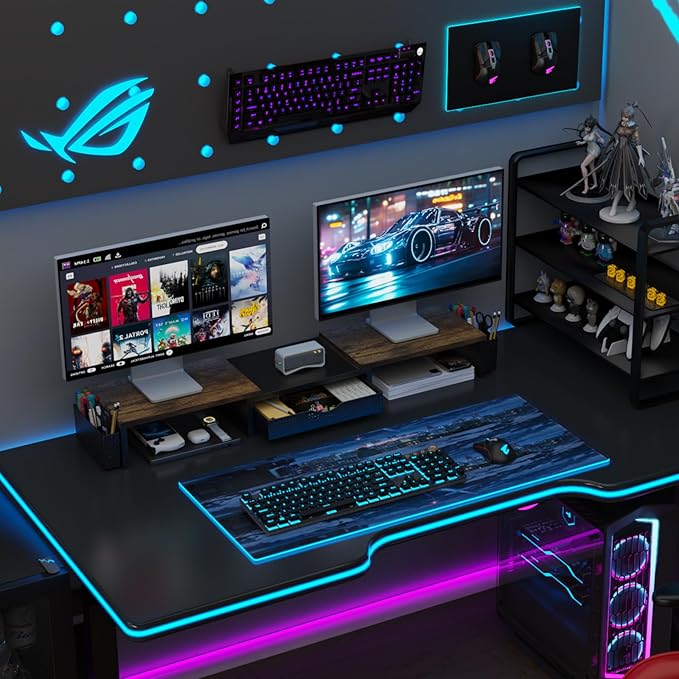 - 【Ample Storage Space】The dual monitor stand features two magnetic pen holders and a drawer, allowing you to easily organize your desk accessories and office supplies, keeping your workspace clear and tidy for easier access.