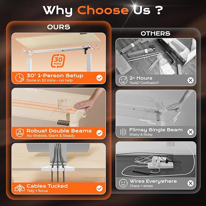 - 【Whisper-Quiet Operation】Powered by a robust yet quiet motor (operating at less than 45 DB), the wide deep desk brings smooth height adjustments without disturbing your household or office environment. This standup desk for home office is ideal for keeping focus and slient